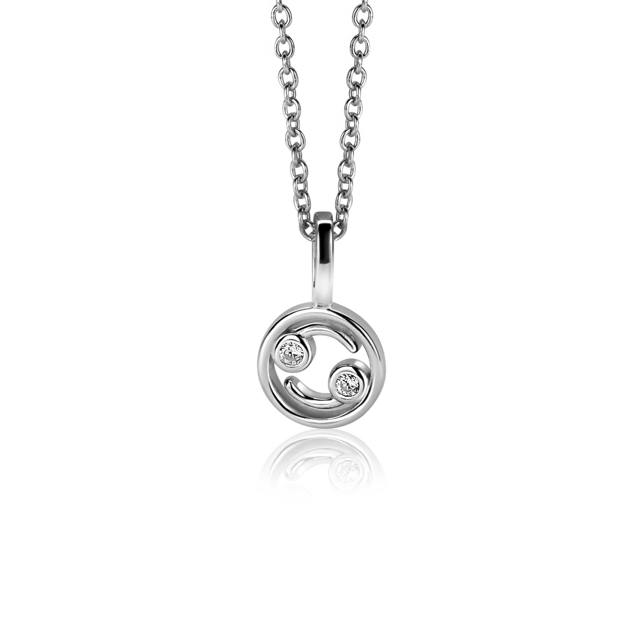 ZINZI zilveren sterrenbeeldhanger Kreeft (21/6 - 22/7), in 9mm diameter. De hanger is speels bezet met witte zirconia. Vervaardigd van eerste gehalte zilver (925) en voorzien van een extra rodiumlaag voor een langdurige glans. De hanger is exclusief ketting geprijsd.
