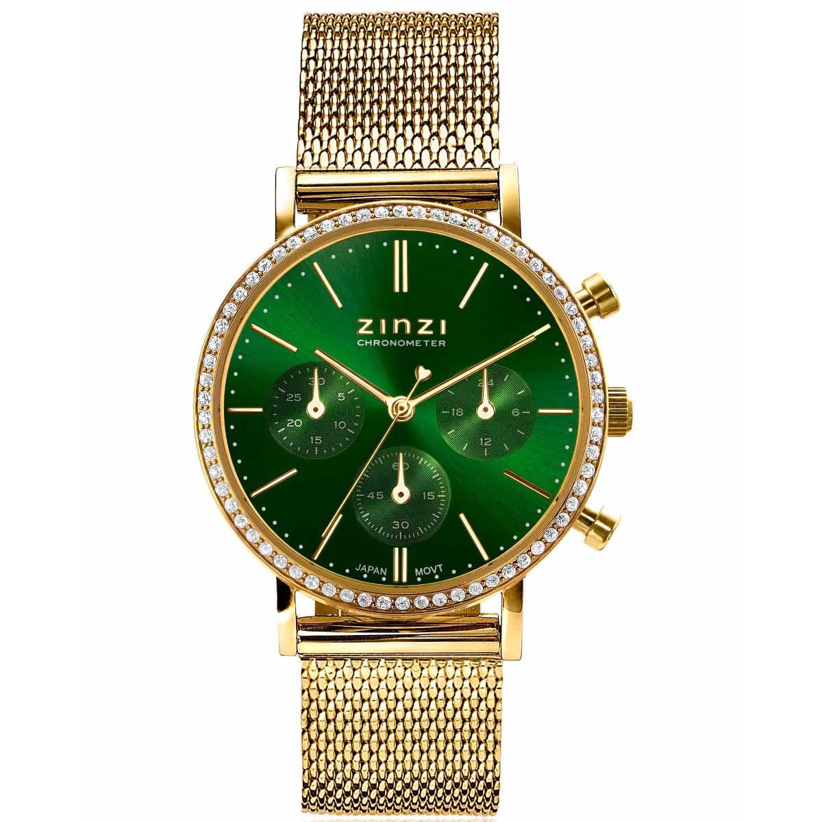 Dit nieuwe Zinzi Chronometer horloge (36mm) is een sportieve eyecatcher. De rand van de geelgoudkleurige ronde kast is bezet met witte crystals en op de groene 'sunray' wijzerplaat sieren 3 chronograph meters . De stopwatch is makkelijk te bedienen en geeft het horloge een stoere uitstraling. Deze 'Chrono Grace' is voorzien van een trendy stalen mesh band in de kleur goud. Ook 5atm waterbestendig (tegen regen en spatwater) en met sterk mineraal glas.
