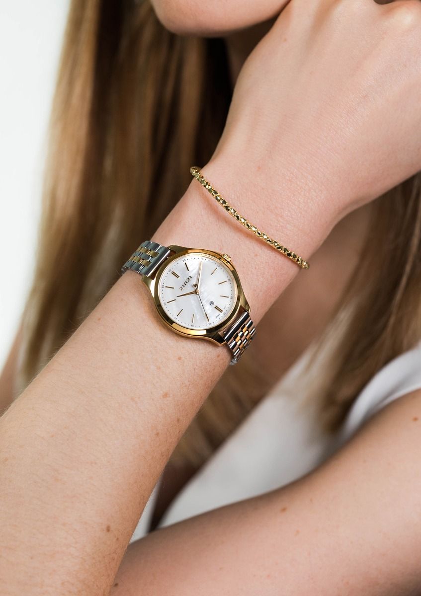 De Classy watch is het nieuwste stijlvolle dameshorloge van Zinzi. Voorzien van een witte parelmoer wijzerplaat met datum en bicolor stalen band met chique clip-sluiting. Natuurlijk met de bekende Zinzi touch ontworpen: het extra dunne Japanse uurwerk met datum en de ronde stalen goudgekleurde kast (34mm) zorgen voor een classy maar fashionable look. Leuk detail: de seconde wijzer met een subtiel hartje en de speelse ronde dag-aanduiding. Ook 5atm waterbestendig (tegen regen en spatwater) en met sterk mineraal glas. Kwaliteit staat bij Zinzi voorop.