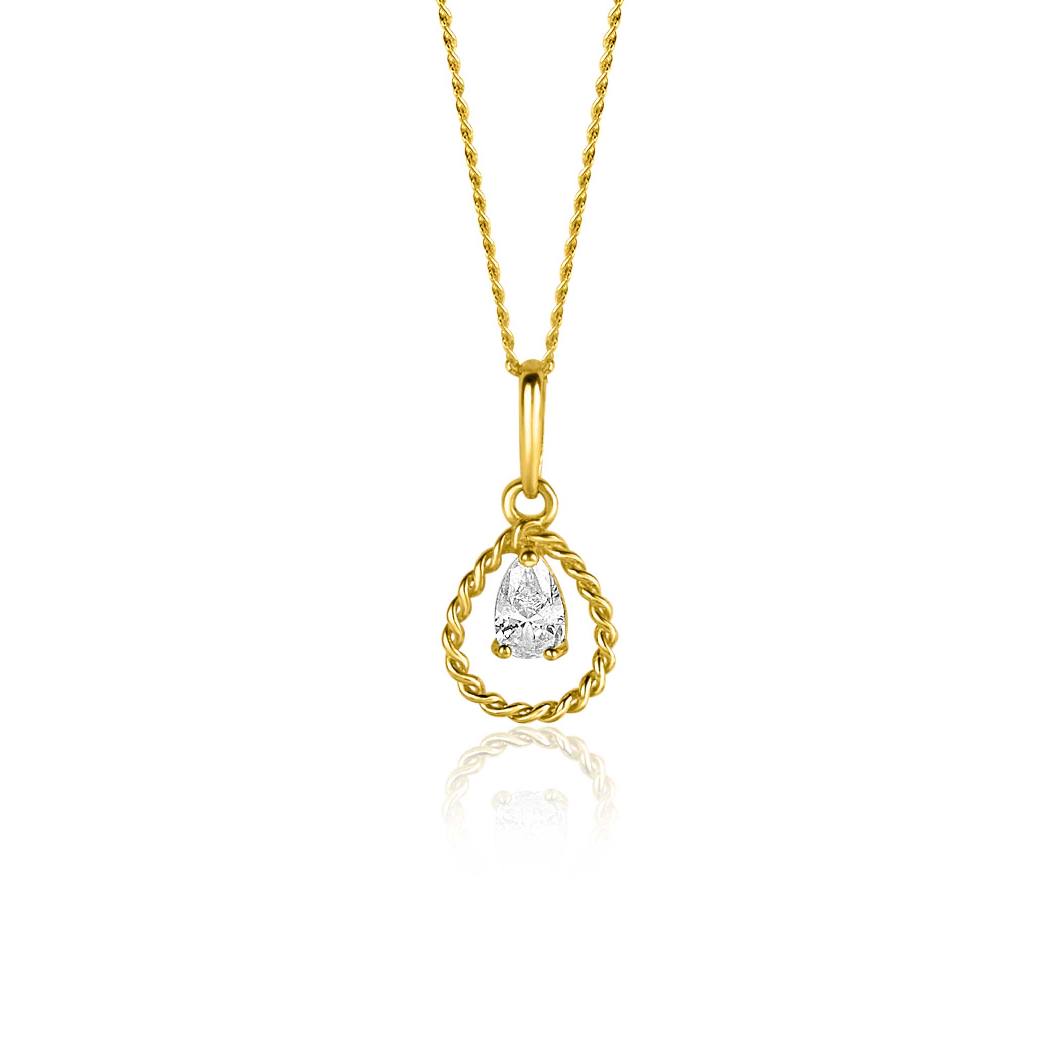 ZINZI Gold 14 krt gouden hanger met open druppelvorm en mooie driepootszetting bezet met een peervormige witte zirconia. De druppelvorm heeft een gedraaid motief. De hanger is 16mm lang (inclusief hangoog). Hang deze hanger sierlijk aan je gouden ZINZI ketting. Ook mooi te combineren met de bijpassende oorbedels! De ketting is niet bij de prijs inbegrepen. Vervaardigd van geheel 14 karaat goud (585).