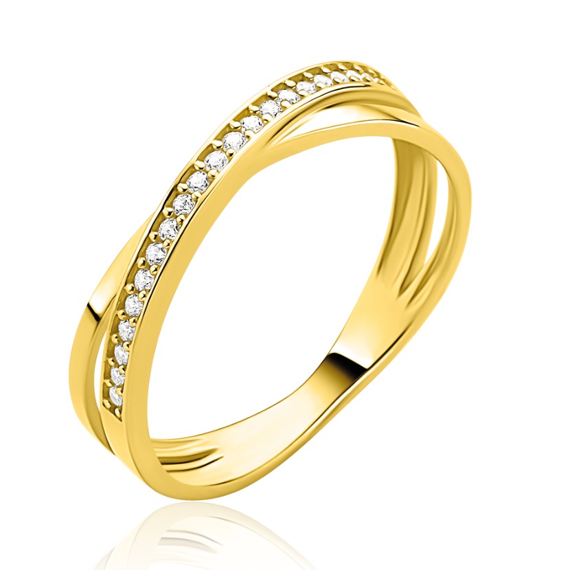 ZINZI Gold 14 krt gouden ring met cross-over design waarbij een gladde band en een band bezet met witte zirconia's elkaar kruisen. Vervaardigd van geheel 14 karaat goud (585).