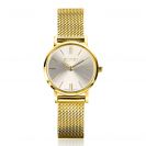 Het ZINZI Retro Mini horloge is het kleinste ronde model van de ZINZI horloges. Met zijn geheel geelgoudkleurige stalen kast van 24mm en zilvergekleurde wijzerplaat oogt dit horloge elegant op iedere pols. Voorzien van een geelgoudkleurige stalen mesh band (12mm breed). Door het mini-model gemakkelijk aan de pols te dragen met meerdere armbandjes.