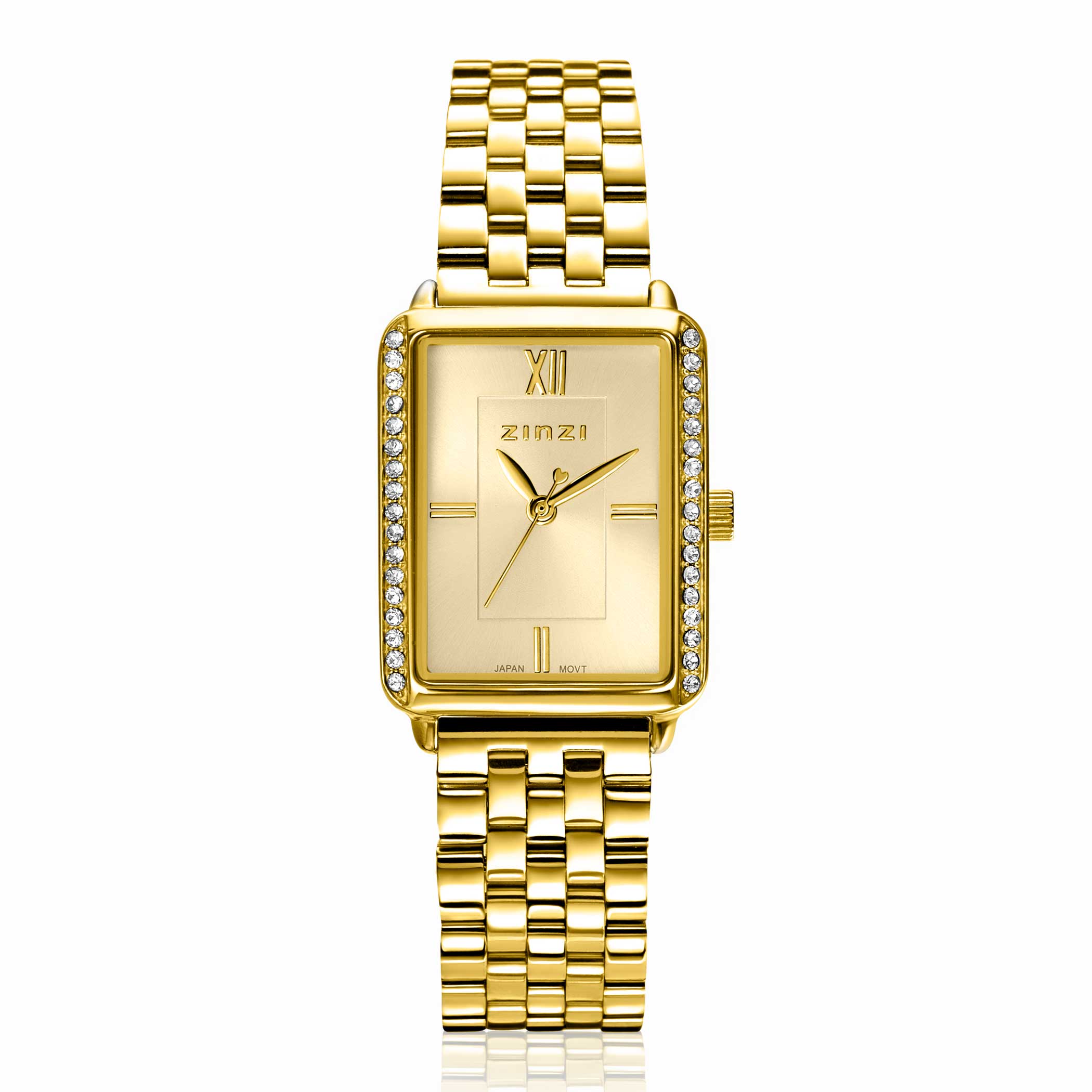 Het ZINZI Lucia horloge heeft een elegant rechthoekig ontwerp, waarbij aan de zijkanten een schitterende rij witte zirkonia's is gezet. Met zijn geheel stalen kast van 28 x 22mm en de prachtige stalen band oogt dit horloge elegant op iedere pols. Voorzien van een goudkleurige wijzerplaat en stalen schakelband in de kleur goud. De band is eenvoudig te verwisselen door het handige schuifsysteem aan de achterkant. Extra kwaliteit: Voorzien van een extra dun Japans kwaliteitsuurwerk, sterk mineraal glas en het horloge is 3atm waterbestendig (tegen regen en spatwater).