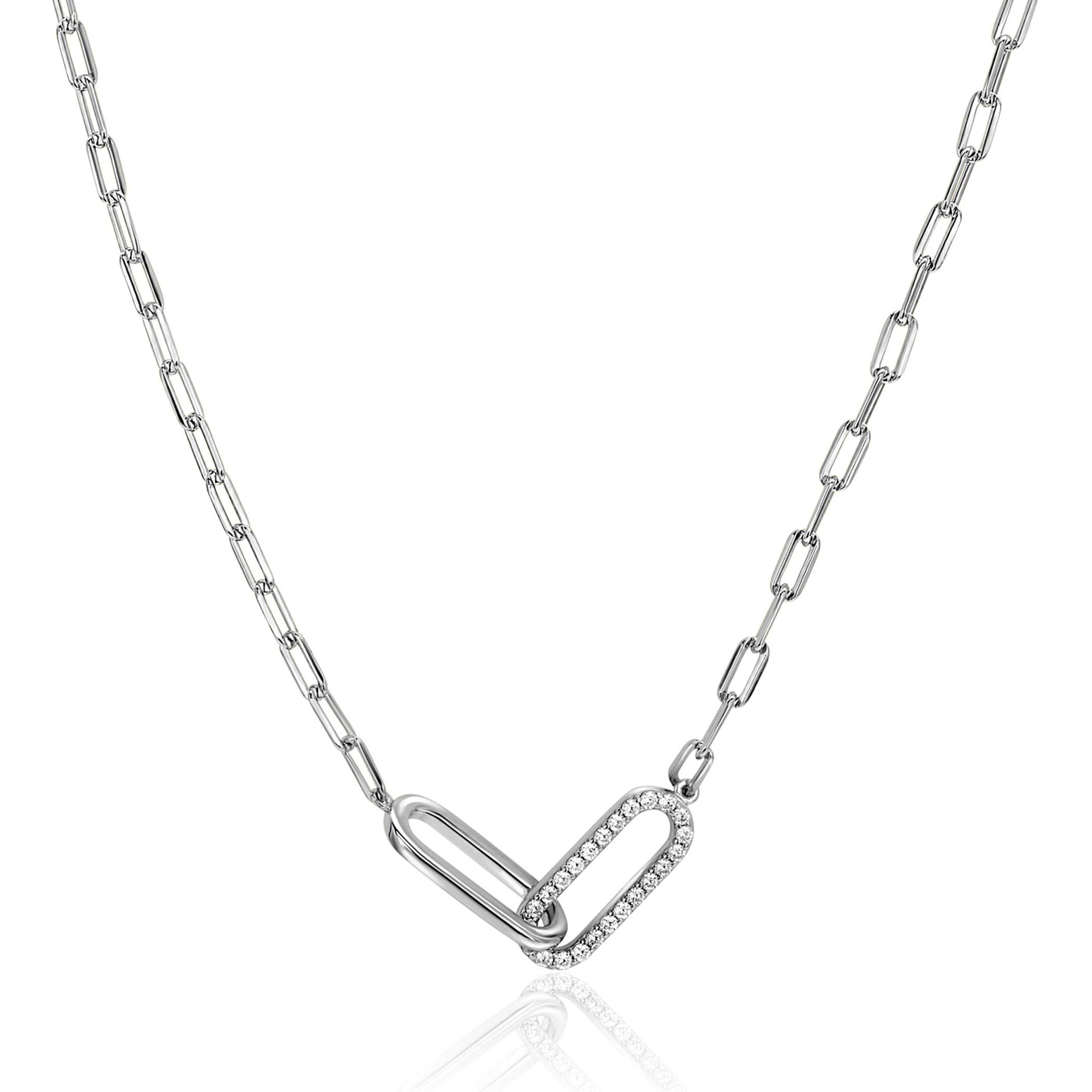 ZINZI zilveren paperclip schakelketting, waarbij in het midden twee open ovale schakels (7mm breed) met elkaar verbonden zijn. Eén ovale schakel is bezet met witte zirkonia's en de andere ovale schakel is glad. De lengte van de ketting is te variëren tussen 40cm en 45cm. Vervaardig van eerste gehalte zilver (925) en en voorzien van een extra rodiumlaag voor een langdurige glans.