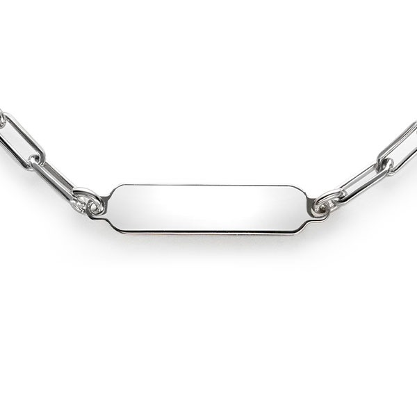 ZINZI zilveren ketting met paperclip schakels en in het midden glanzend rechthoekig plaatje. Het plaatje is 16 mm lang en 4,2 mm breed. Mooi om een gravure in te zetten. Met herkenbaar Zinzi hartje bij de sluiting. De lengte van de ketting is te variëren tussen 42 en 45 cm. De ketting is vervaardigd van eerste gehalte zilver (925) en voorzien van een extra rodiumlaag voor een langdurige glans.