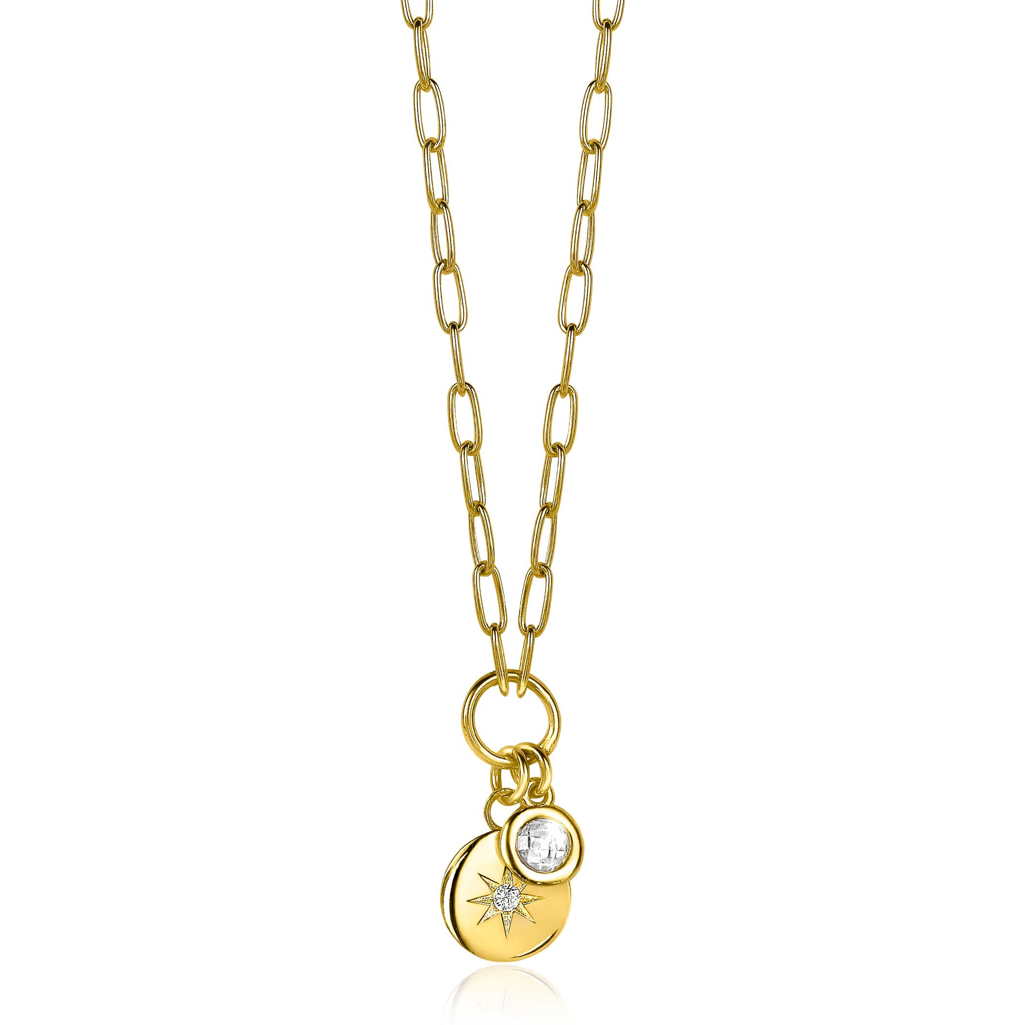 ZINZI zilveren ketting [45cm] in 14K geel verguld met trendy 'paperclip' schakels. Aan een kleine ronde cirkel hangen twee bedels: een ronde witte zirconia en een groter glad rondje met een glinsterende zon bezet. Vervaardigd van eerste gehalte zilver (925) en met extra rodiumlaag voor een langdurige glans.