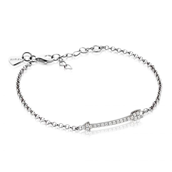 ZINZI zilveren collier met Cupido pijl als design, vol gezet met witte zirconia's. De lengte van het collier is 42-45cm en wordt kort op de hals gedragen. Bij sluiting herkenbaar ZINZI, door het zilveren Zinzi hartje.