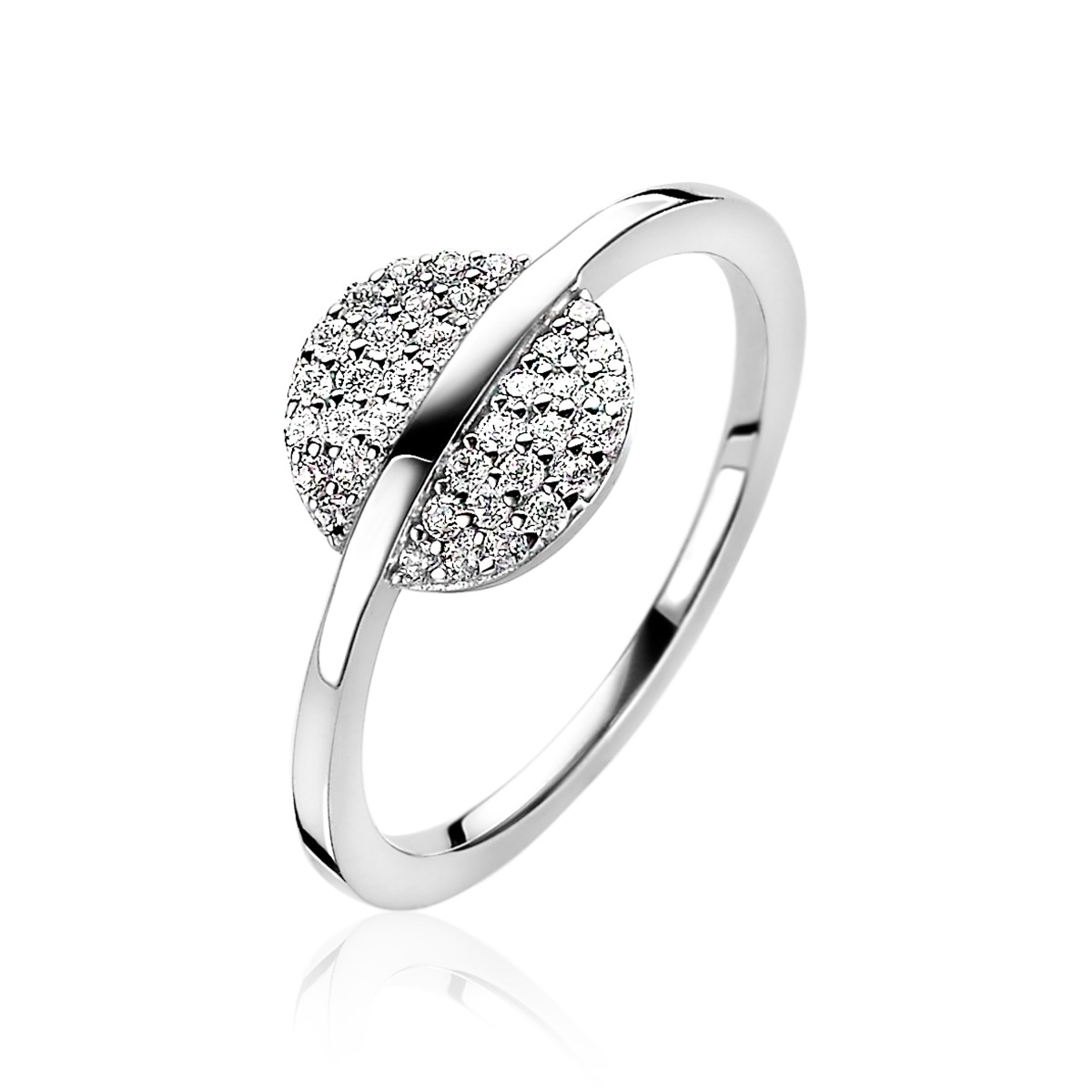 ZINZI zilveren luxe ring, waarbij de gladde scheen sierlijk over een vol pavé bezet rondje met witte zirconia's loopt. De ring is vervaardigd van eerste gehalte zilver (925) en voorzien van een extra rodiumlaag voor een langdurige glans.