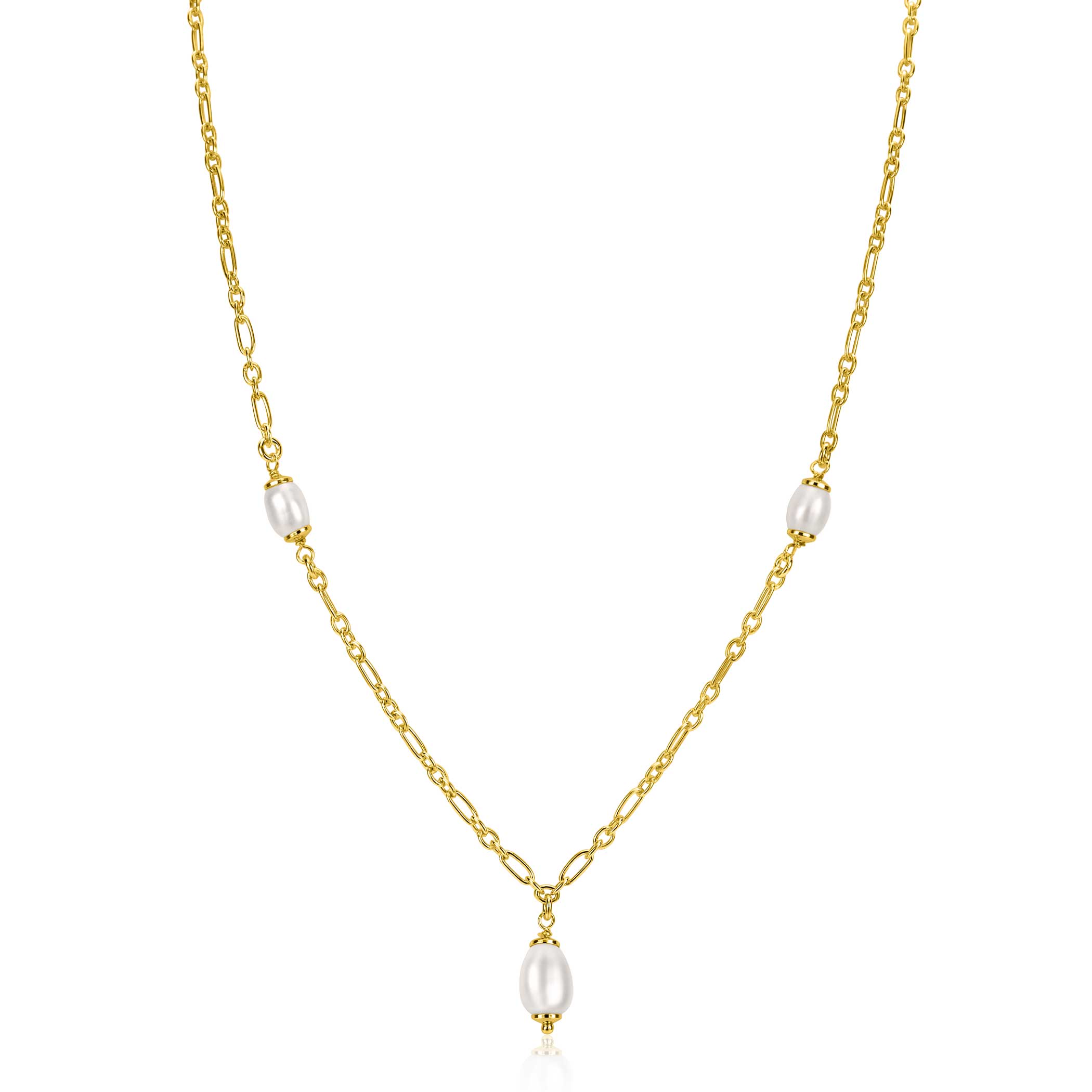 ZINZI gold plated zilveren schakelketting met drie ovale witte zoetwaterparels, speels verdeeld over de ketting. De parels zijn natuurlijk gevormd en nooit perfect ovaal. De lengte van de ketting is te variëren tussen 40cm en 45cm. Vervaardigd van eerste gehalte zilver (925) en extra geel verguld.