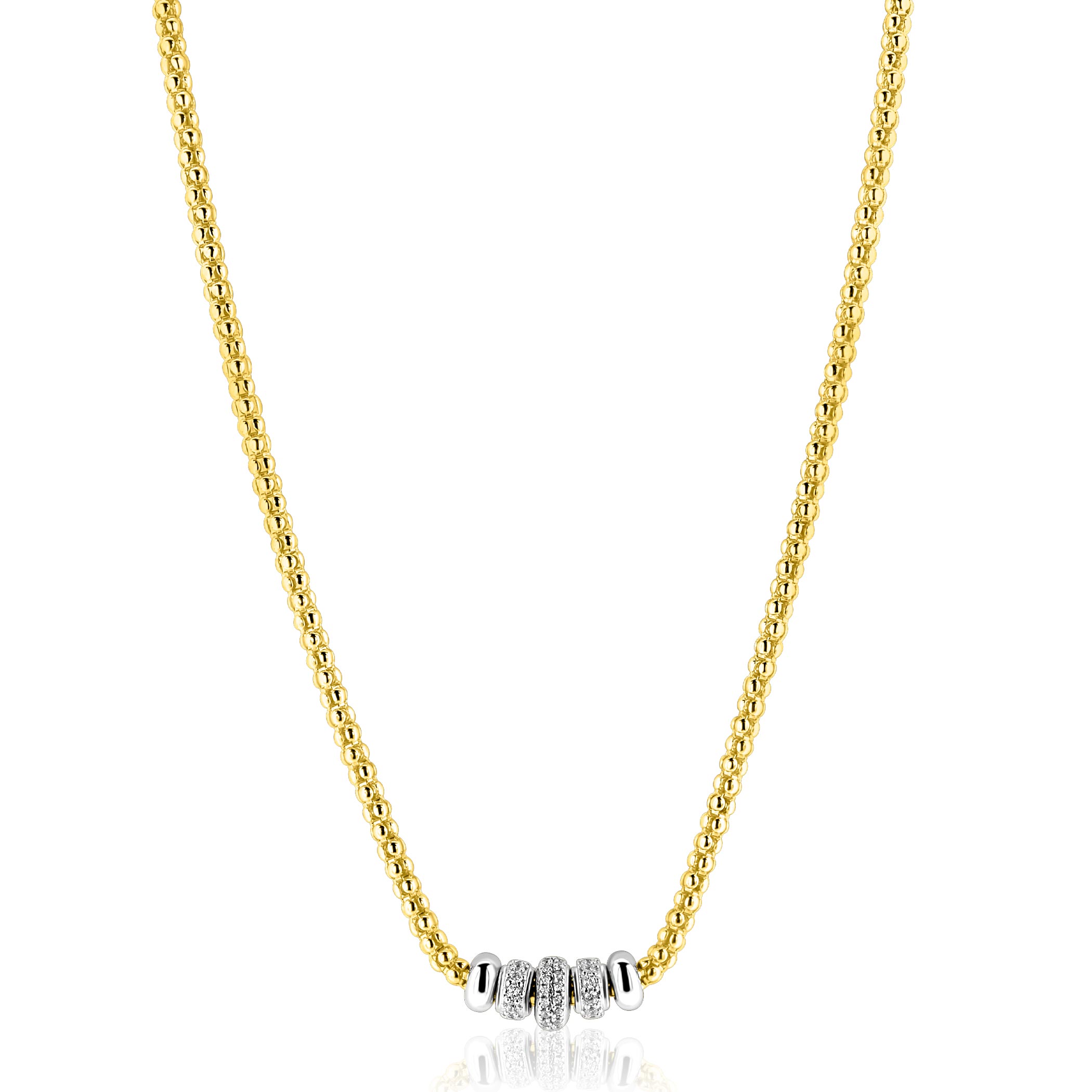 ZINZI goldplated zilveren popcorn schakelcollier 48cm met vijf sierlijke, beweegbare beads in zilver en wit zirkonia. De lengte is verstelbaar van 42 tot 48 cm. Vervaardigd van eerste gehalte zilver (925) en extra verguld.