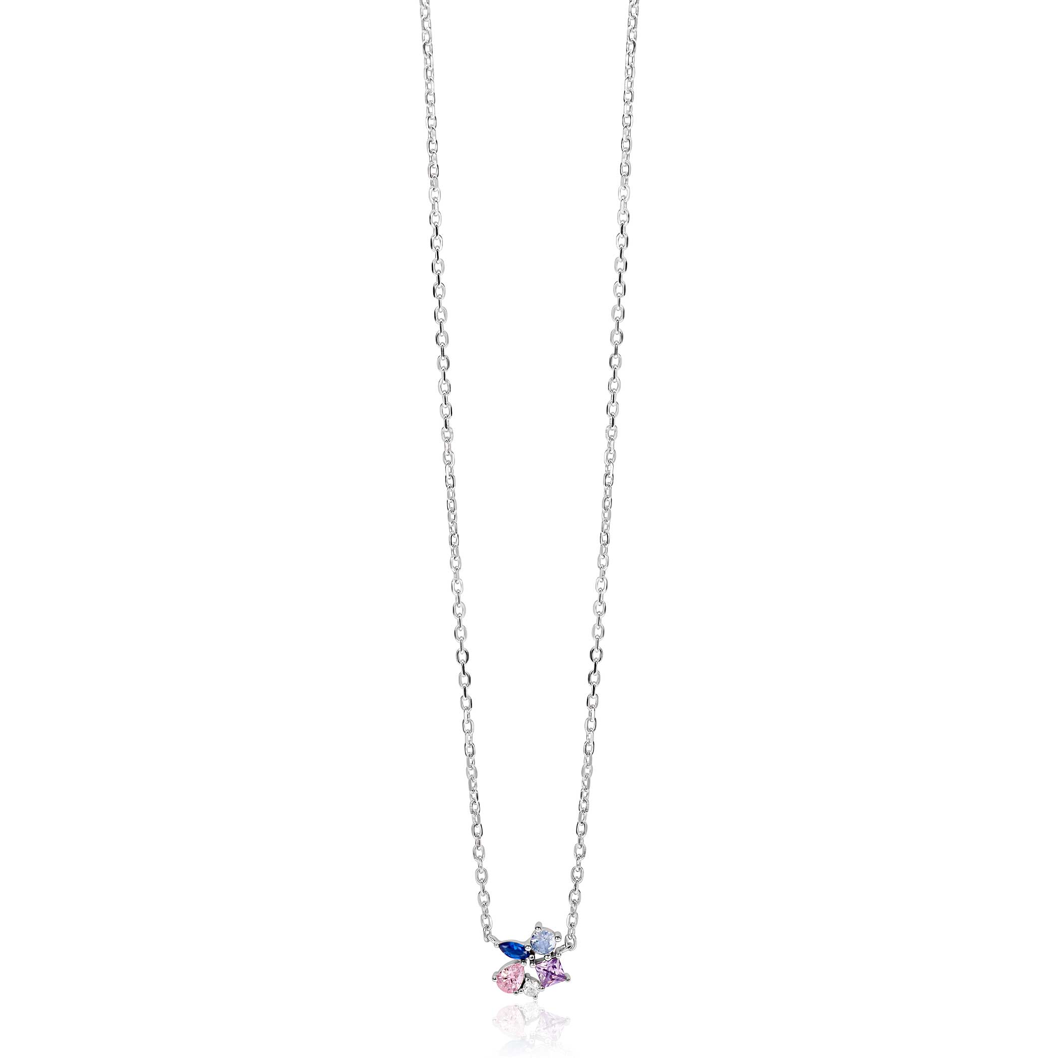 ZINZI zilveren ketting met speelse hanger (8mm) bezet met een mooie combinatie van witte, roze, paarse en blauwe kleurstenen in verschillende slijpvormen. De mix van ronde, vierkante, druppel- en markiesvormige stenen geeft deze ketting een kleurrijke uitstraling. Vervaardigd van eerste gehalte zilver (925) en voorzien van een extra rodiumlaag voor een langdurige glans.