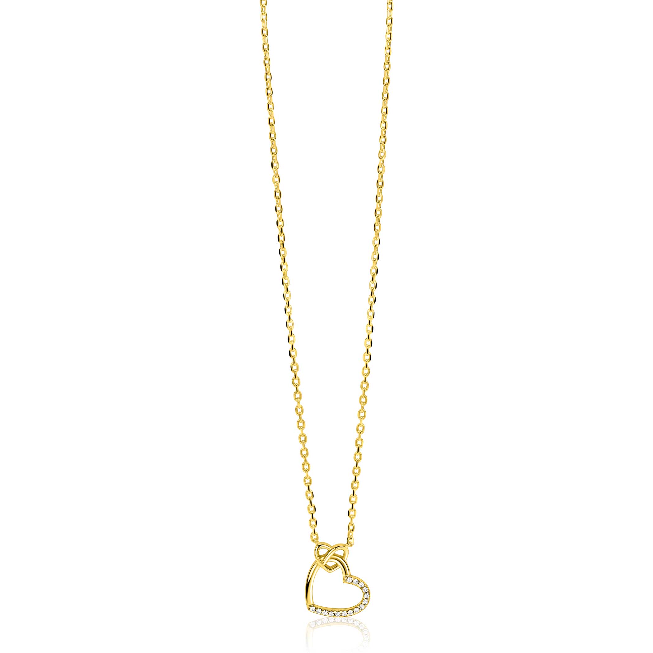 ZINZI gold plated zilveren ketting met twee sierlijke harten die met elkaar verbonden zijn, waarvan het grotere hart half bezet is met witte zirkonia’s. De lengte van de ketting is te variëren tussen de 42cm en 45cm. Vervaardigd van eerste gehalte zilver (925) en extra geel verguld.
