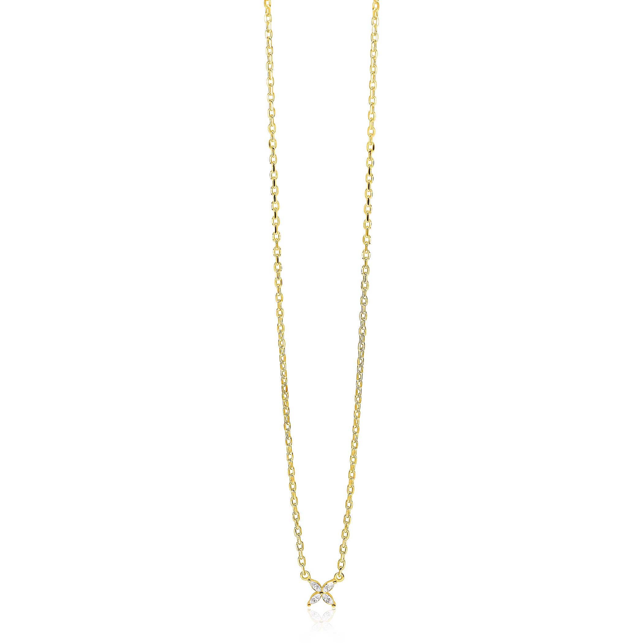 ZINZI gold plated zilveren ketting met bloem (6mm) bezet met vier druppelvormige witte zirconia's. De lengte van de ketting is te variëren tussen 42 en 45cm. De ketting is vervaardigd van eerste gehalte zilver (925) en extra geel verguld.
