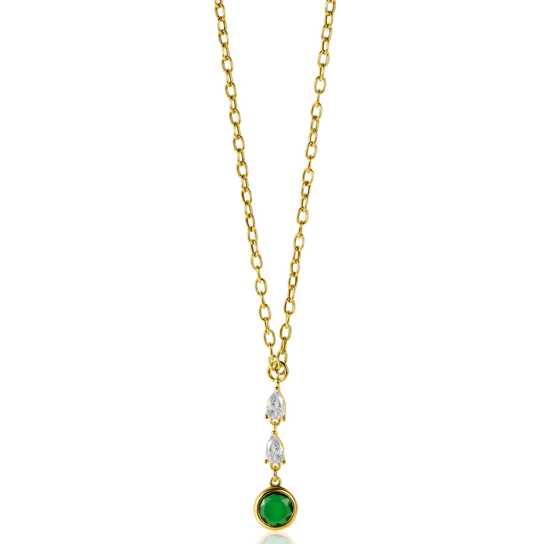 ZINZI gold plated zilveren schakelketting met ovale schakels en schitterende hanger. De lange hanger (31mm) is bezet met twee peervormige witte zirconia's en een ronde groene kleursteen. Mooi te combineren met bijpassende armband en oorsieraden! Met herkenbaar Zinzi hartje bij de sluiting. De lengte is te variëren tussen 40 en 45 cm. Vervaardigd van eerste gehalte zilver (925) en extra geel verguld.
