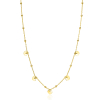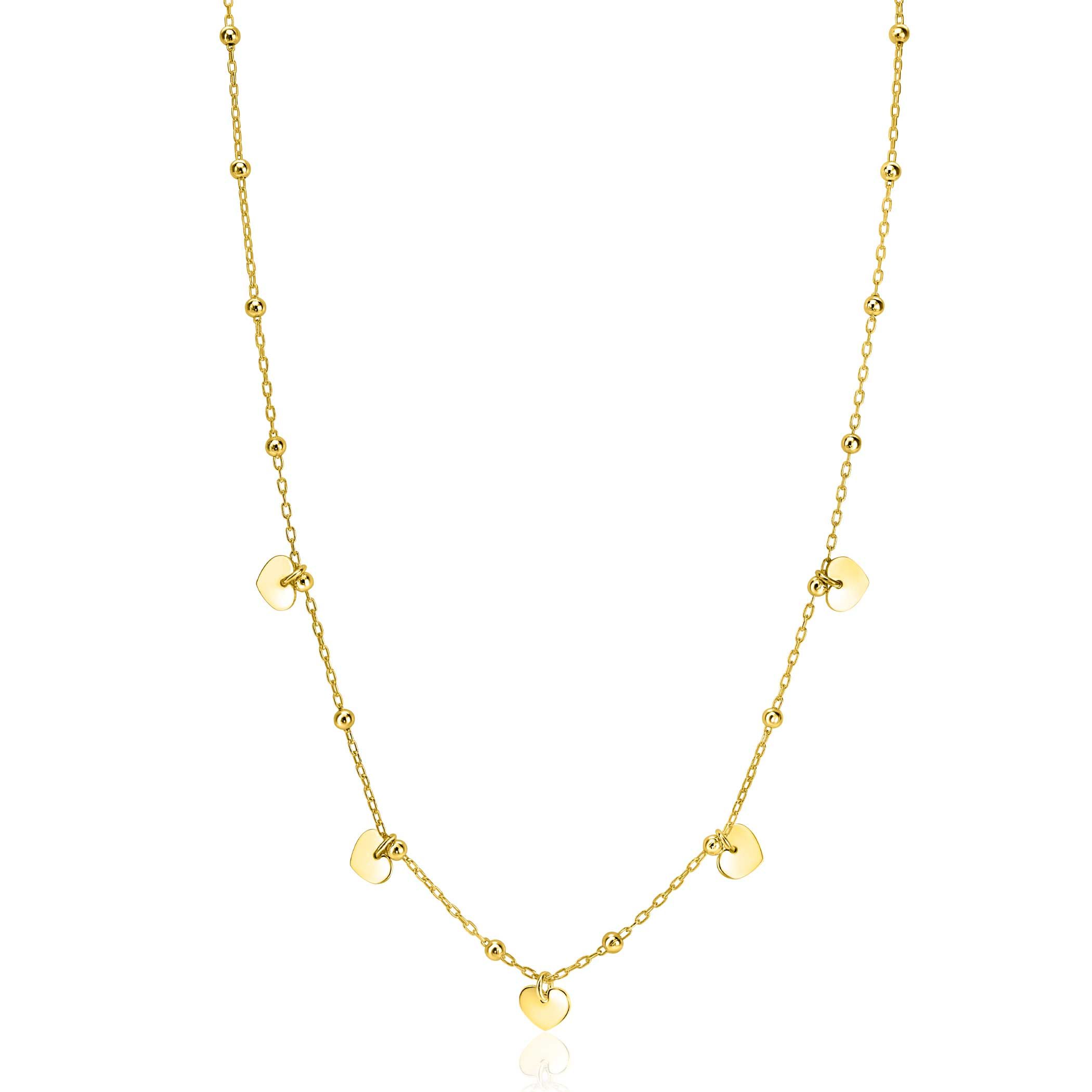 ZINZI gold plated zilveren ankerketting met kleine bolletjes en vijf hartjes sierlijk hangend aan de ketting. De gladde hartjes zijn 7mm breed. Met herkenbaar Zinzi hartje bij de sluiting. De lengte is te variëren tussen 42 en 45 cm. De ketting is vervaardigd van eerste gehalte zilver (925) en extra geel verguld.