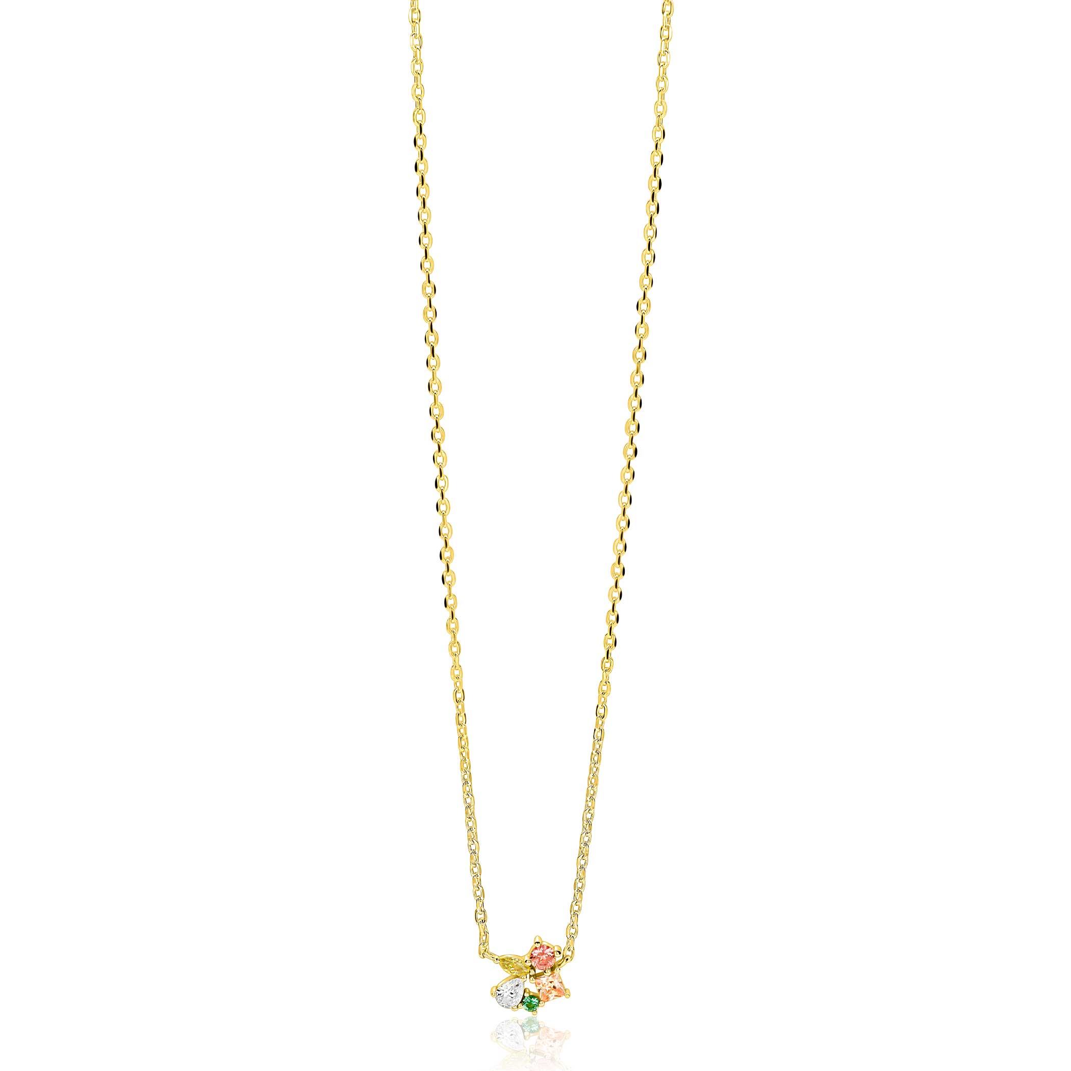 ZINZI gold plated zilveren ketting met speelse hanger (8mm) bezet met een mooie combinatie van bruine, groene en witte kleurstenen in verschillende slijpvormen. De mix van ronde, vierkante, druppel- en markiesvormige stenen geeft deze ketting een kleurrijke uitstraling. Vervaardigd van eerste gehalte zilver (925) en extra geel verguld.