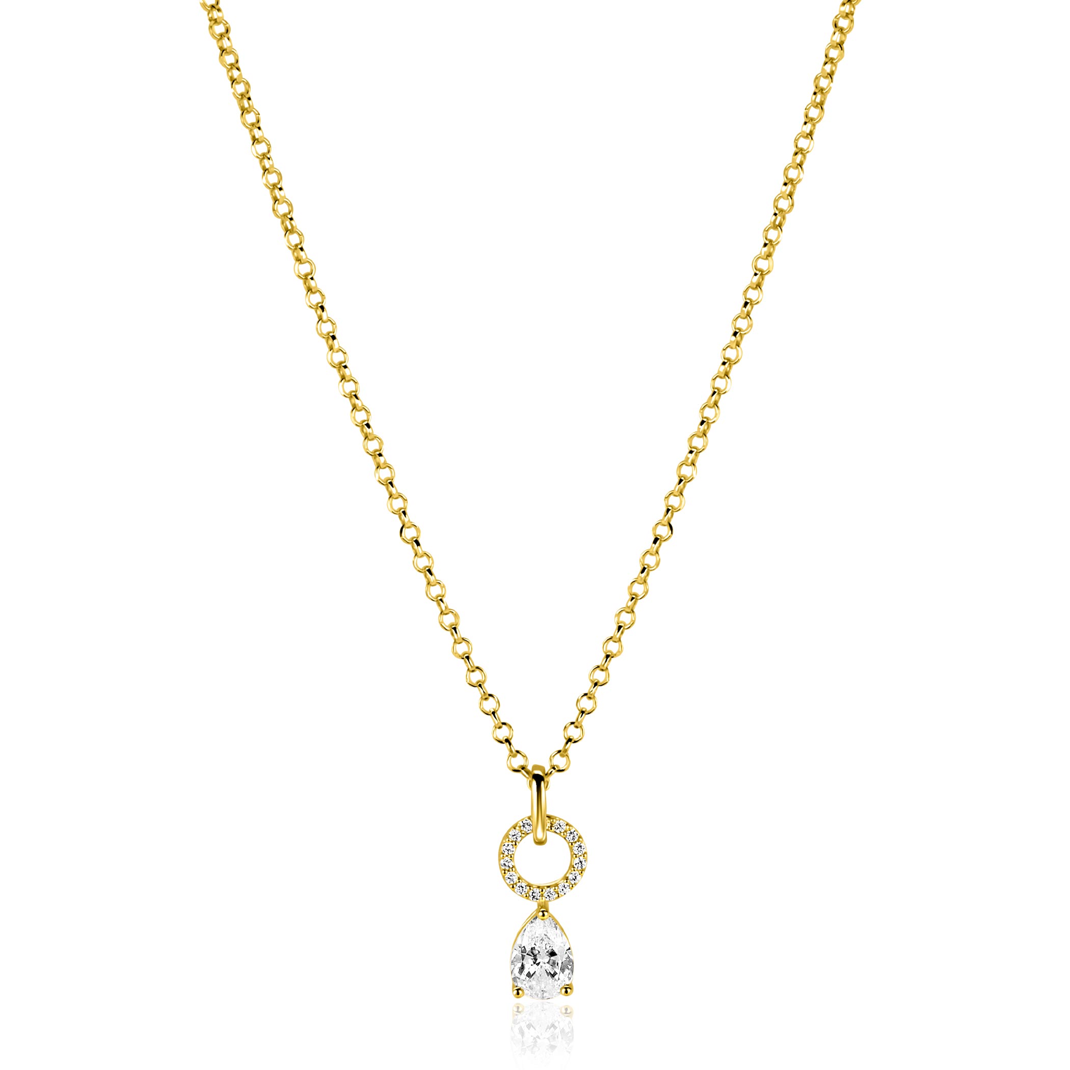 ZINZI gold plated zilveren ketting met open rondje bezet met witte zirconia's en daaronder een opvallende peervormige zirconia hanger. De ketting is verstelbaar van 42 tot 45 cm. Vervaardigd van eerste gehalte zilver (925) en extra geel verguld.