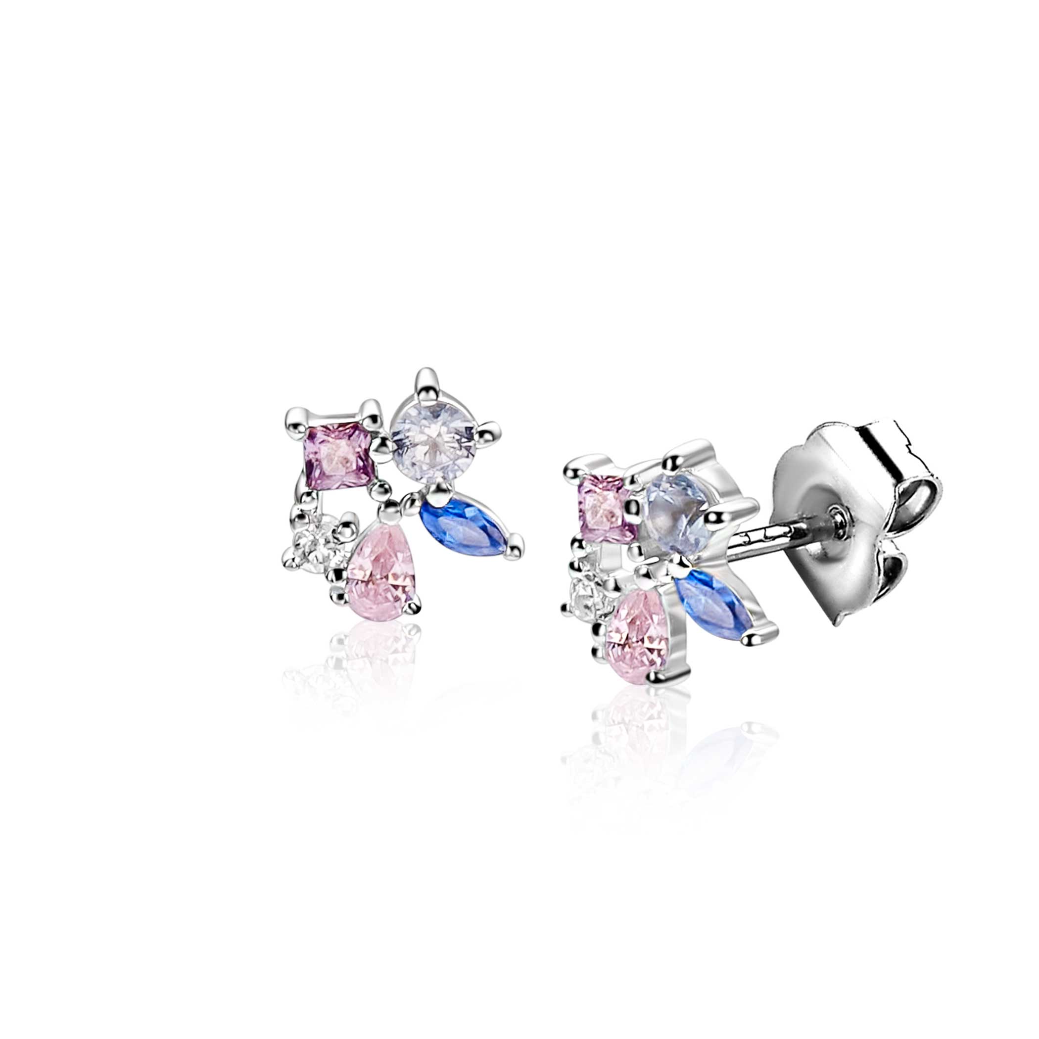 ZINZI zilveren oorstekers 8mm bezet met een speelse combinatie van witte, roze, paarse en blauwe kleurstenen in verschillende slijpvormen. De mix van ronde, vierkante, druppel- en markiesvormige stenen geeft deze oorstekers een kleurrijke uitstraling. Vervaardigd van eerste gehalte zilver (925) en voorzien van een extra rodiumlaag voor een langdurige glans.