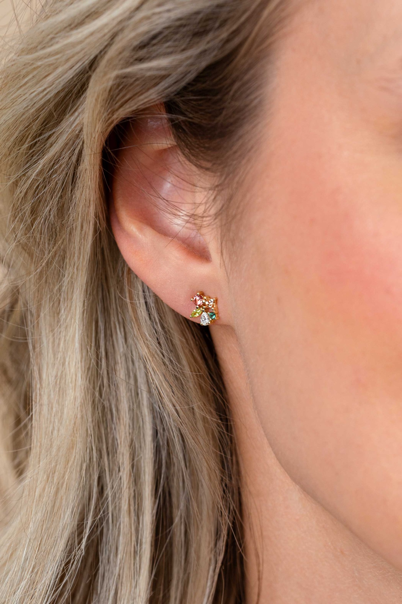 ZINZI gold plated zilveren oorstekers 8mm bezet met een speelse combinatie van bruine, groene en witte kleurstenen in verschillende slijpvormen. De mix van ronde, vierkante, druppel- en markiesvormige stenen geeft deze oorstekers een kleurrijke uitstraling. Vervaardigd van eerste gehalte zilver (925) en extra geel verguld.