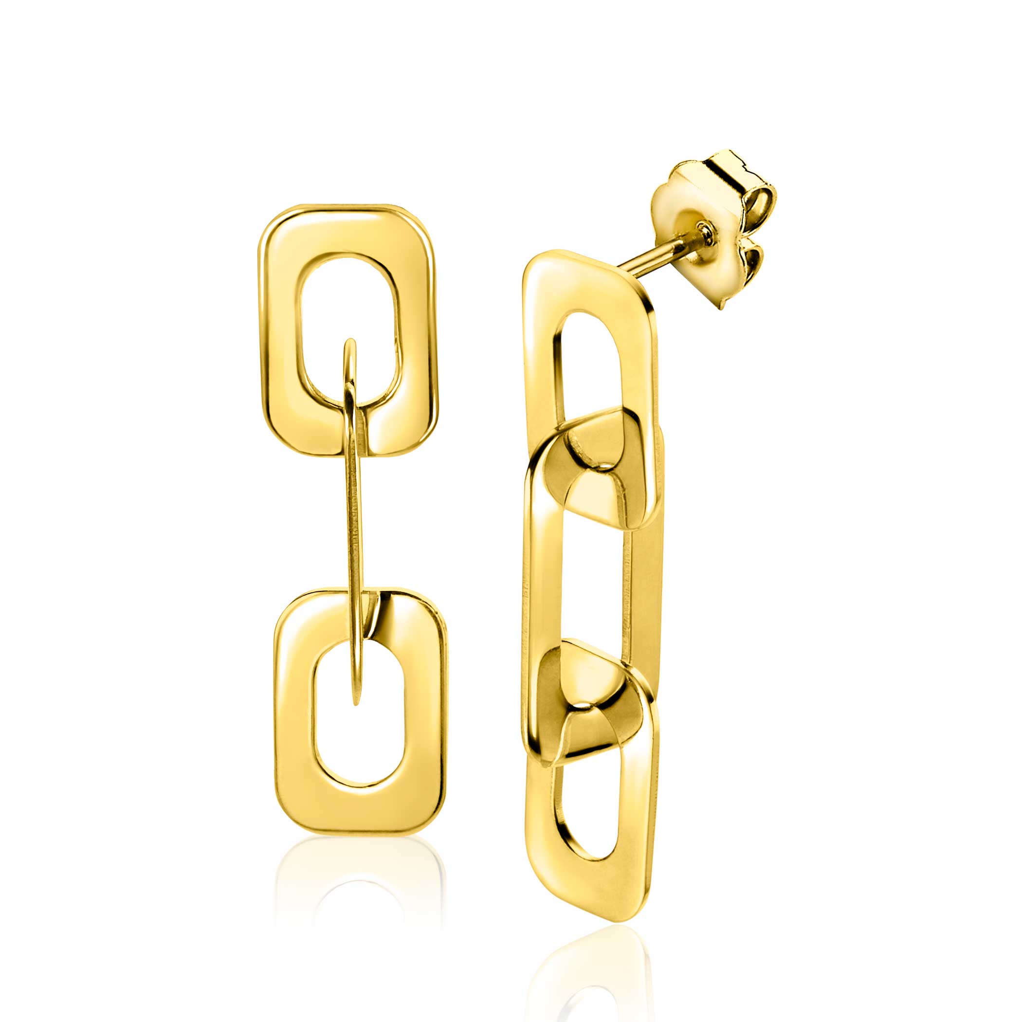 ZINZI gold plated zilveren oorstekers met drie gladde rechthoekige schakels. De oorsieraden zijn 31mm lang. Combineer de oorsieraden met de bijpassende armband of ketting. Vervaardigd van eerste gehalte zilver (925) en voorzien van een extra geel vergulding.