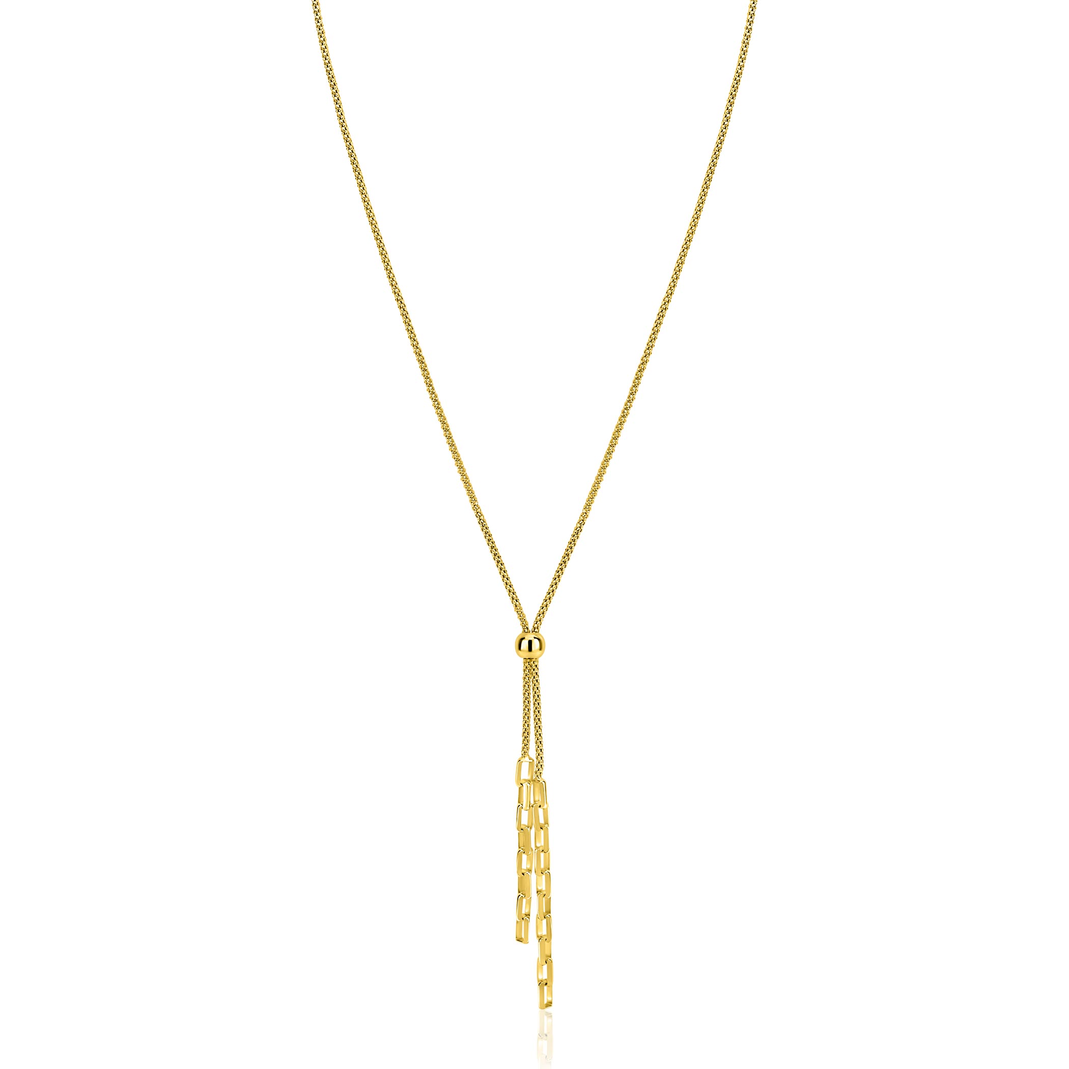 ZINZI gold plated zilveren Y-collier in popcorn-schakel en met twee bungelende paperclip-kettinkjes,die elegant in een Y-vorm over het decolleté vallen. De lengte van de ketting is verstelbaar van 43cm tot 46cm. Vervaardigd van eerste gehalte zilver (925) en extra geel verguld.